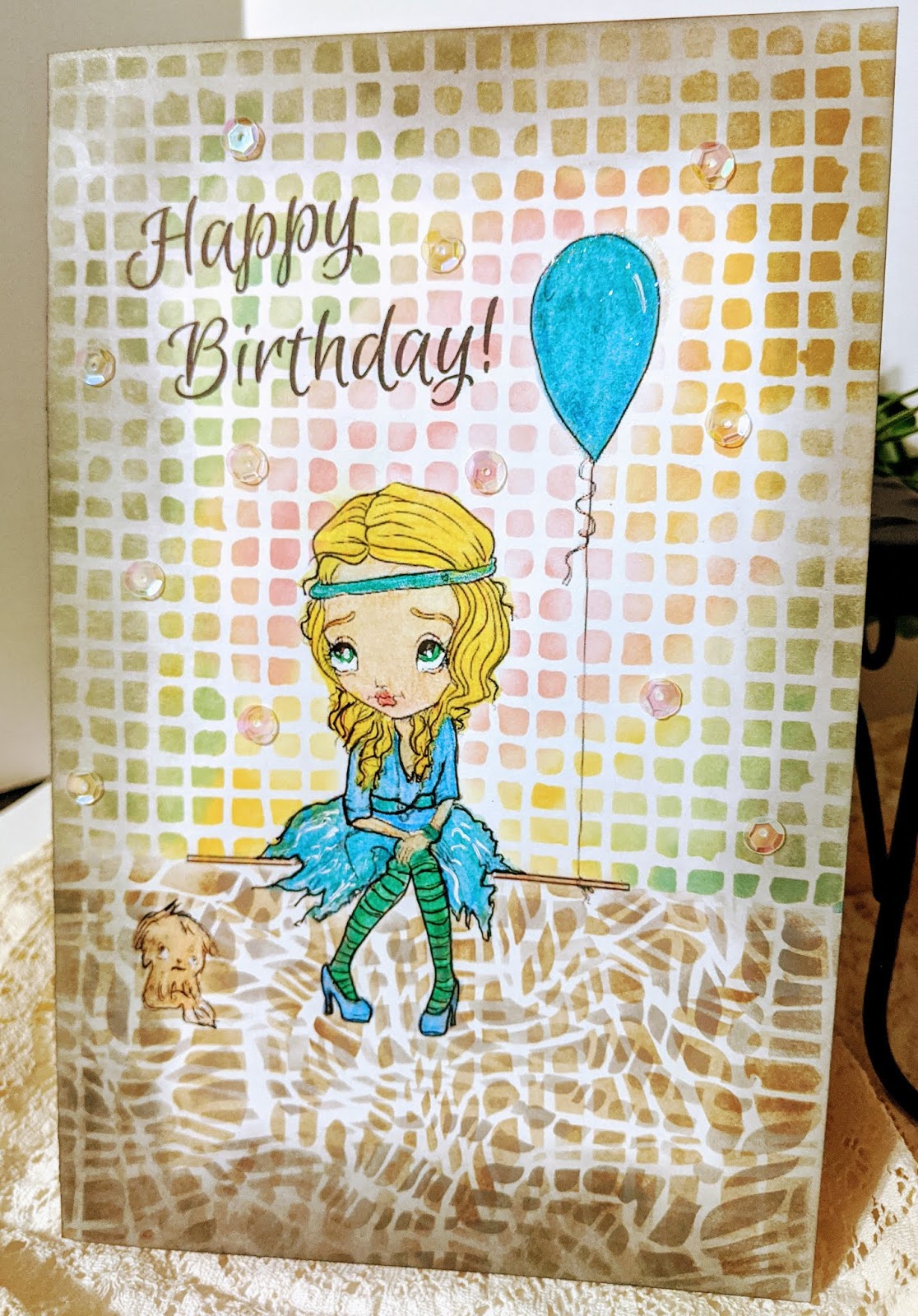 I create this card, I printed the image on white cardstock then colored her with Prisma Inktense pencils, then using TCW stencils to ink the background around the birthday girl. I then used black soot ink to darken the edges of the card, to stamp Happy Birthday using the stamp from Blank Page Muse and added clear sequins for some sparkle.
